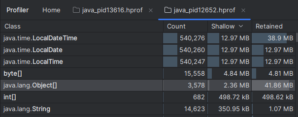 LocalDateTime.now().toString()위의 메소드로 String 타입으로 저장하도록 했지만 메모리 덤프에서도 String객체가 558,211번 호출되고, 힙 메모리의 50MB중 40.08MB이 사용되었습니다.