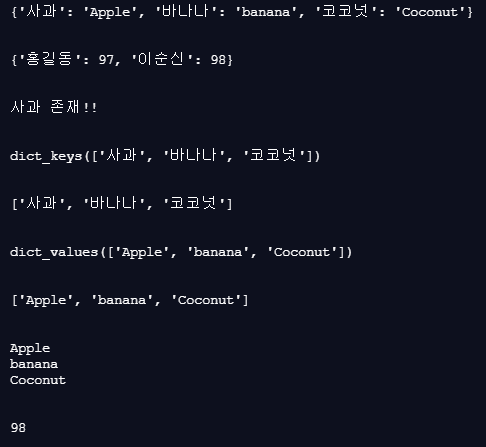 #사전 자료형-------------------------------------- data = dict() data['사과'] = 'Apple' data['바나나'] = 'banana' data['코코넛'] = 'Coconut' print(data) print('\n') #초기화 방법2 b = { '홍길동' : 97, '이순신' : 98 } print(b) print('\n') if '사과' in data: print('사과 존재!!') print('\n') #키 데이터만 담은 리스트 key_list = data.keys() #--> 사전 키 '객체'로 반환됨 print(key_list) print('\n') key_list = list(data.keys()) #--> 리스트로 형변환 해야함 print(key_list) print('\n') #값 데이터만 담은 리스트 value_list = data.values() print(value_list) print('\n') value_list = list(data.values()) print(value_list) print('\n') #각 키에 따른 값을 하나씩 출력 for key in key_list: print(data[key]) print('\n') #특정 값 출력 print(b['이순신']) #키에 따른 값 출력 print('\n')