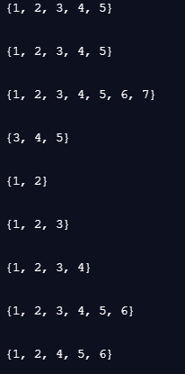 #집합 자료형 : set( )---------------------------------- #초기화 1 set_data = set([1,1,2,3,4,4,5]) print(set_data) #중복 원소는 제거됨 print('\n') #초기화 2 set_data = {1,1,2,3,4,4,5} print(set_data) #중복 원소는 제거됨 print('\n') #집합 자료형의 연산 set_a = set([1,2,3,4,5]) set_b = set([3,4,5,6,7]) #합집합 : or연산 print(set_a | set_b) print('\n') #교집합 : and연산 print(set_a & set_b) print('\n') #차집합 : -연산 print(set_a - set_b) print('\n') #집합 자료형 관련 함수 set_c = set([1,2,3]) print(set_c) print('\n') #새로운 원소 추가 set_c.add(4) print(set_c) print('\n') #새로운 원소 여러 개 추가 set_c.update([5,6]) print(set_c) print('\n') #특정 값을 갖는 원소 삭제 set_c.remove(3) print(set_c) print('\n')