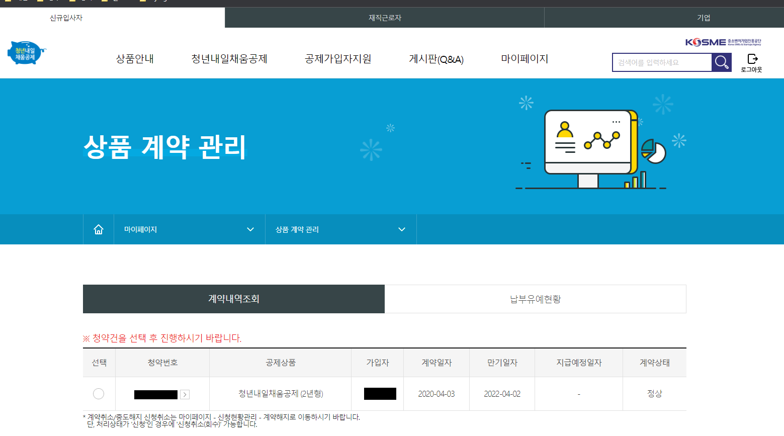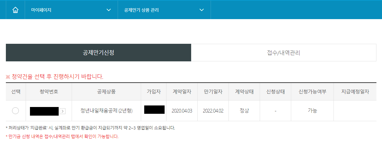만기 일자가 지났지만, 기업기여금과 정부지원금이 아직 4회차까지만 납부되어 청약 만기 조건이 되지 않아 기다렸습니다.