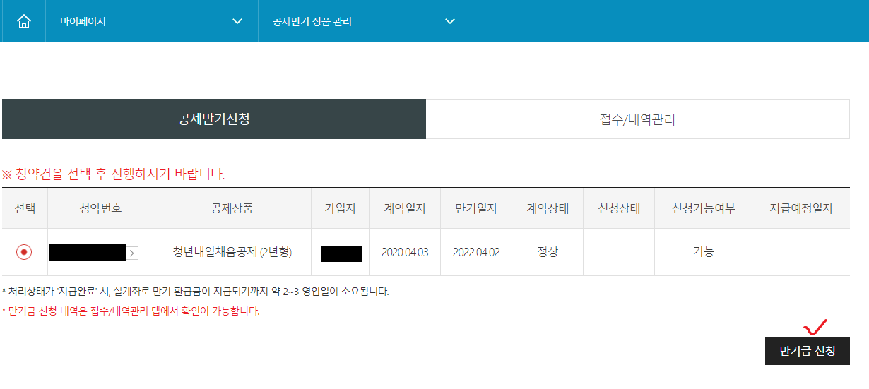 청약 선택 후 만기금 신청을 클릭하면!!!