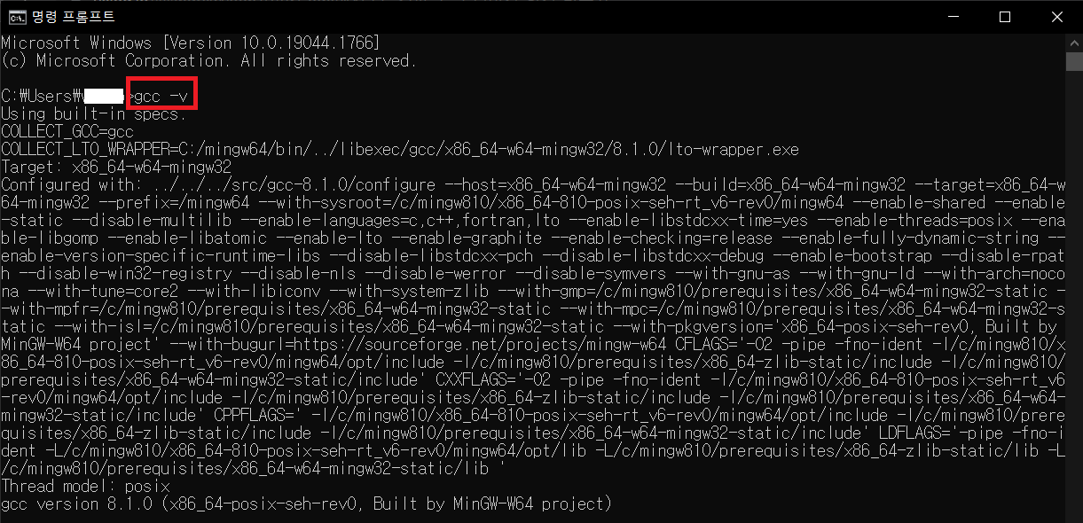 cmd를 실행하고 "gcc -v" 명령어를 입력해서 설치가 완료됬는지 확인합니다.