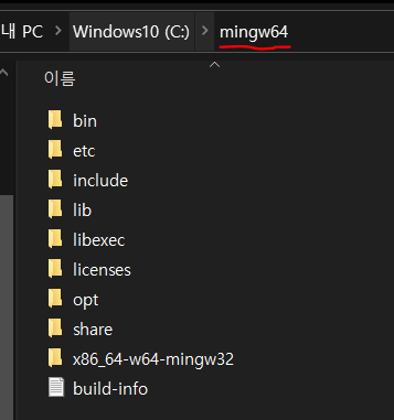 압축해제한 "mingw64" 디렉토리는 c드라이브에 위치시켜 주세요.
