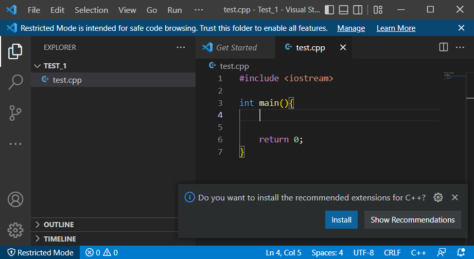 새로운 cpp파일을 만들면 c++에서 요구하는 확장프로그램을 설치하라는 알림이 뜹니다.