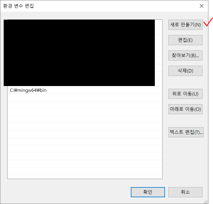"새로 만들기" 버튼 클릭 후 "mingw64" 디렉토리가 있는 경로를 입력합니다.