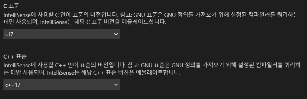 저는 c17, c++17 으로 설정하겠습니다. 해당사항은 사용하고 있는 표준에 따라 다르게 설정할 수 있습니다.