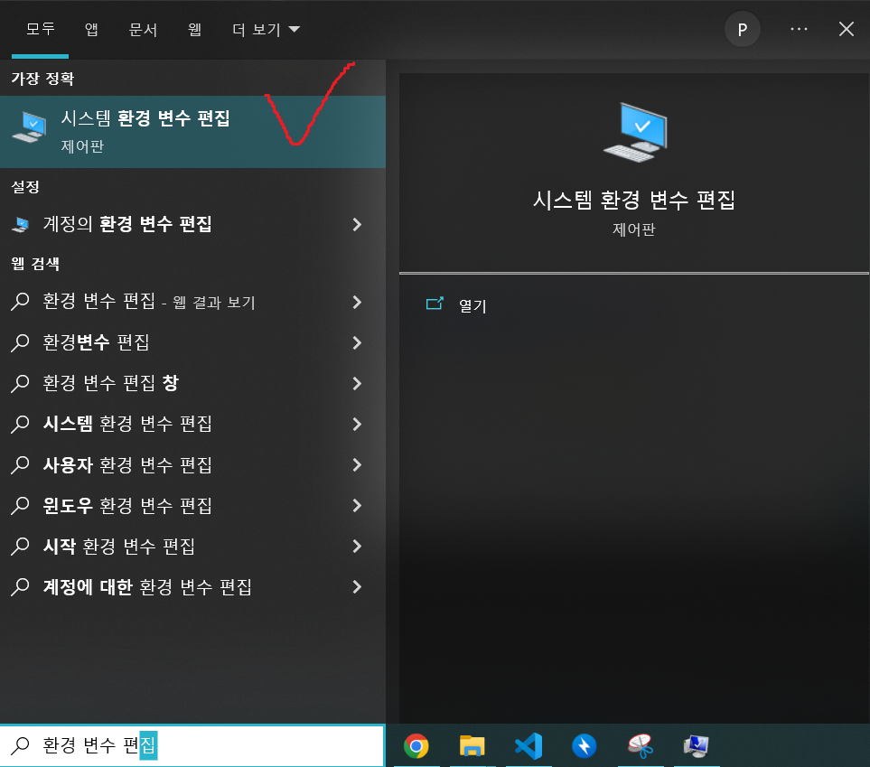 시스템 환경 변수 편집을 검색하여 환경 변수 편집기를 실행합니다.