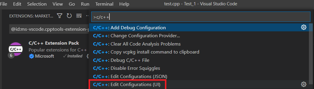 ctrl + shift + p (F1)단축키를 입력 후 c/c++검색하여 Edit Configurations(UI)를 선택합니다.