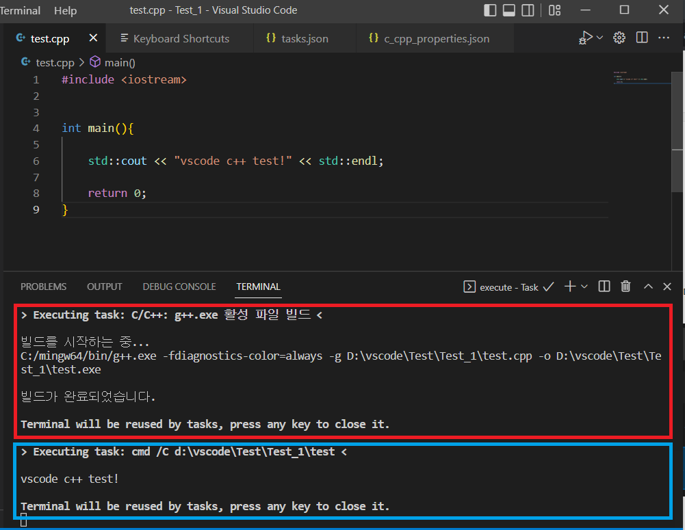 { "version": "2.0.0", "runner": "terminal", "type": "shell", "echoCommand": true, "presentation": { "reveal": "always" }, "tasks": [ { "label": "save and compile for C++", "command": "g++", "args": [ "${file}", "-g", "-o", "${fileDirname}/${fileBasenameNoExtension}" ], "group": "build", "problemMatcher": { "fileLocation": [ "relative", "${workspaceRoot}" ], "pattern": { "regexp": "^(.*):(\\d+):(\\d+):\\s+(warning error):\\s+(.*)$", "file": 1, "line": 2, "column": 3, "severity": 4, "message": 5 } } }, { "label": "save and compile for C", "command": "gcc", "args": [ "${file}", "-g", "-o", "${fileDirname}/${fileBasenameNoExtension}" ], "group": "build", "problemMatcher": { "fileLocation": [ "relative", "${workspaceRoot}" ], "pattern": { "regexp": "^(.*):(\\d+):(\\d+):\\s+(warning error):\\s+(.*)$", "file": 1, "line": 2, "column": 3, "severity": 4, "message": 5 } } }, { "label": "execute", "command": "cmd", "group": "test", "args": [ "/C", "${fileDirname}\\${fileBasenameNoExtension}" ] }, { "type": "cppbuild", "label": "C/C++: g++.exe 활성 파일 빌드", "command": "C:/mingw64/bin/g++.exe", "args": [ "-fdiagnostics-color=always", "-g", "${file}", "-o", "${fileDirname}\\${fileBasenameNoExtension}.exe" ], "options": { "cwd": "C:/mingw64/bin" }, "problemMatcher": [ "$gcc" ], "group": { "kind": "build", "isDefault": true }, "detail": "디버거에서 생성된 작업입니다." } ] }(5) Build, Execute 단축키 확인