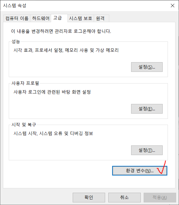 "환경 변수" 버튼을 클릭합니다.