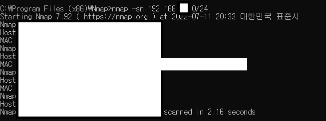cmd에서 nmap이 설치되어 있는 경로에서 nmap 명령어를 입력합니다.