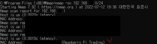 nmap -sn 192.168.1.0/24포트 스캔을 하기 위해서는 메인PC와 라즈베리파이가 같은 공유기를 사용하고 있어야 합니다.