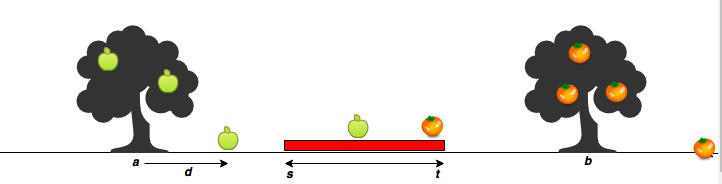 - The red region denotes the house, where s is the start point, and t is the endpoint. The apple tree is to the left of the house, and the orange tree is to its right.