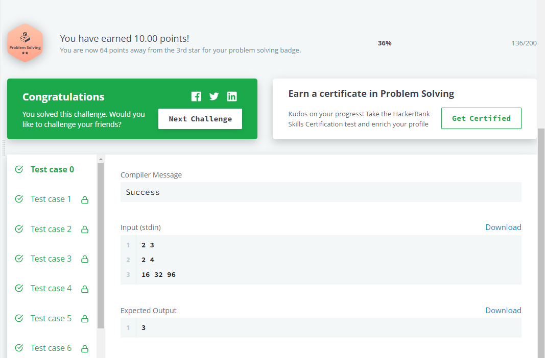 int gcd(int a, int b){ //최대공약수 구하기 if(b > a){ int temp = b; b = a; a = temp; } while(b){ int c= a % b; a = b; b = c; } return a; } int lcm(int a, int b){ //최소공배수 구하기 return a * b / gcd(a, b); } int getTotalX(vector<int> a, vector<int> b) { int cnt = 0; int lcmA = a.at(0), gcdB = b.at(0); int gcdA = a.at(0); for(int i = 1; i < a.size(); i++){ lcmA = lcm(a[i], lcmA); //a 원소들의 최소공배수 구하기 if(lcmA > 100) return 0; //runtime error 방지 } for(int i = 1; i < b.size(); i++){ gcdB = gcd(b[i], gcdB); //b 원소들의 최대공약수 구하기 } if( (gcdB == 0) || (lcmA > 100) || (lcmA > gcdB) ) return 0; for(int i = lcmA; i <= gcdB; i++){ //최소공배수와 최대공약수 사이의 정수 중에서 if((gcdB%i == 0 )&& (i % lcmA == 0)) cnt++; //최대공약수의 약수이고, 최소공배수의 배수인지 검사 } return cnt; }