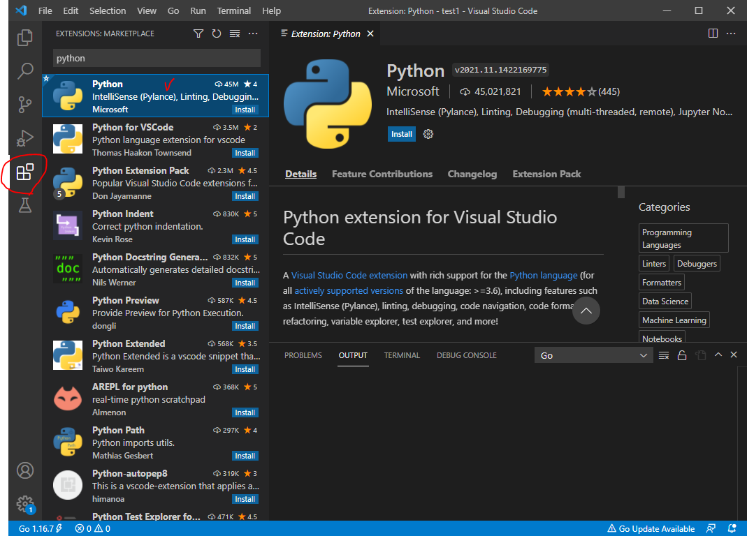 1. 먼저 visual studio code에 python을 검색 후 install 버튼을 클릭합니다.